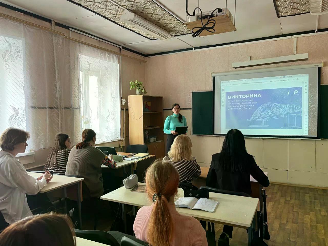 В текущем году наша страна празднует 12 годовщину важного события новейшей истории – воссоединения полуострова Крым с Россией. В этот день в 2014 году Республика Крым и город-герой Севастополь официально вошли в состав Российской Федерации. Советник директора по воспитанию и взаимодействию с детскими общественными объединениями Можайская А. В. провела для обучающихся Болховского педагогического колледжа увлекательную информинутку, посвященную Дню воссоединения России с Крымом. Эта важная дата символизирует исторический путь полуострова, ставшего символом единства и патриотизма.