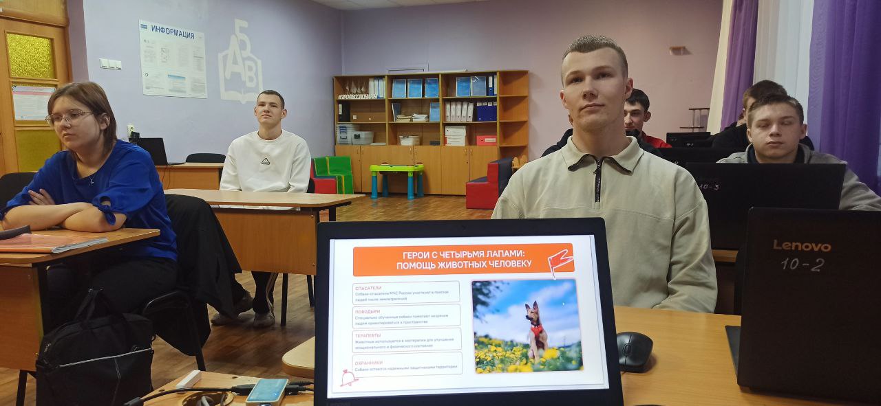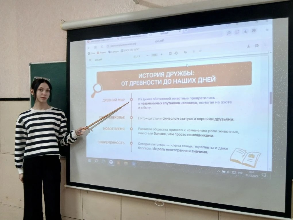 С целью актуализации у обучающихся представлений о роли и значении домашних питомцев в жизни человека, развития сознательного и ответственного отношения к животным, экологической культуры, мотивации к исполнению домашних и социальных обязанностей по содержанию питомца, формирования представлений о мерах государственного регулирования содержания животных и защиты дикой природы, воспитания уважительного отношения к людям, оказывающим помощь на безвозмездной основе, развитие стремления совершать добрые дела, 1 декабря обучающиеся Болховского педагогического колледжа приняли участие во внеурочном занятие «Разговоры о важном». Каждый день животные дарят нам свою преданность и заботу: спасают жизни людей, поддерживают их в трудные минуты и наполняют мир искренностью и счастьем. Они не просто существуют рядом — они делают нас человечнее. И наша осознанная забота, защита и внимание — это не просто долг, а естественное проявление благодарности тем, кто бескорыстно нам доверяет.