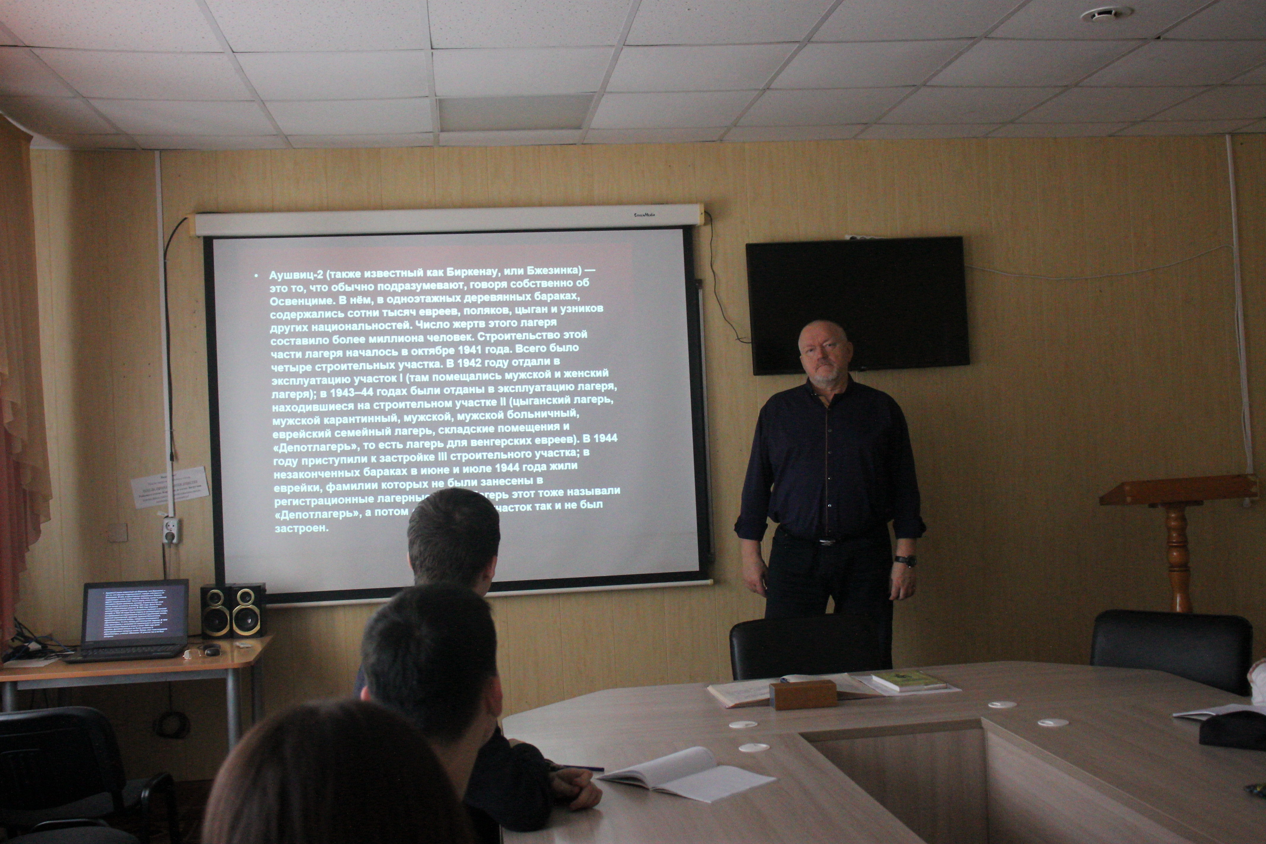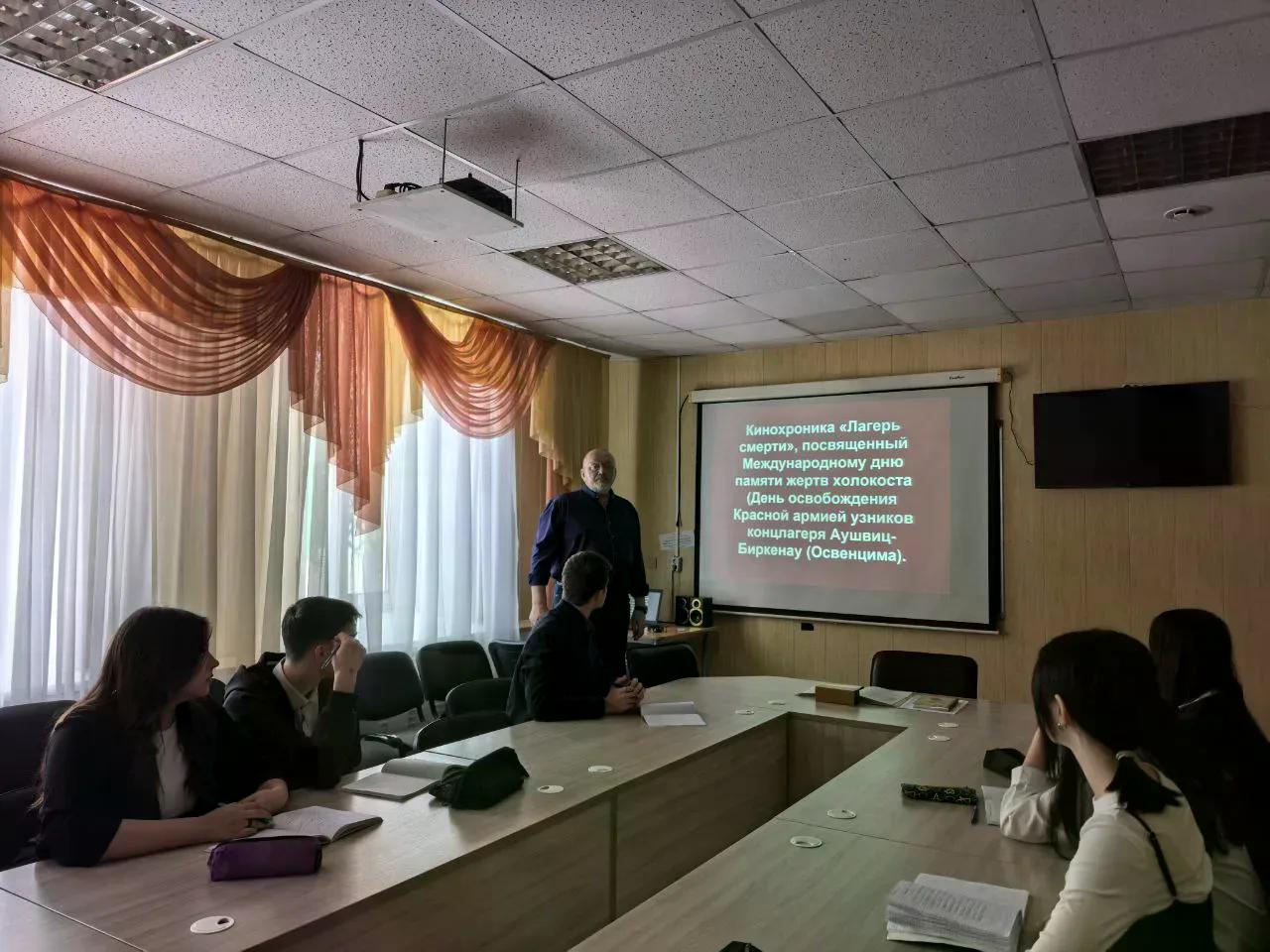 27 января – День освобождения Красной армией крупнейшего «лагеря смерти» Аушвиц-Биркенау (Освенцима) – День памяти жертв Холокоста. В памятную дату в Болховском педагогическом колледже прошел киноурок «Лагерь смерти», посвященный Международному дню памяти жертв холокоста. В рамках встречи участники мероприятия совместно с преподавателем Гуляевым П. А. посмотрели и обсудили кинохронику, снятую операторами 1-го Украинского фронта после прихода войск Красной Армии в Освенцим.