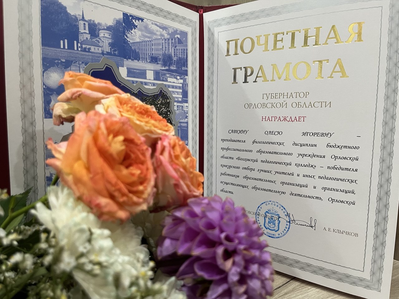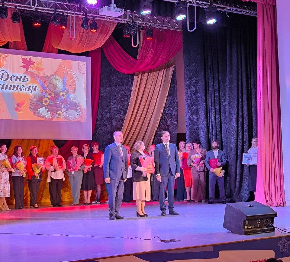 Торжественное мероприятие, посвященное Дню учителя, состоялось 3 октября во Дворце пионеров и школьников им. Ю. А. Гагарина в городе Орле. Работников системы образования Орловской области поздравили Губернатор Андрей Клычков и первый заместитель Председателя Орловского областного Совета народных депутатов Михаил Вдовин. В торжественной обстановке учителям и преподавателям образовательных учреждений региона были вручены сертификаты победителей конкурсного отбора на присуждение премий лучшим учителям за достижения в педагогической деятельности в 2024 году, а также Почетные грамоты и Благодарности Губернатора Орловской области, награды Орловского областного Совета народных депутатов. Среди награждаемых преподаватель филологических дисциплин Болховского педагогического колледжа Савкина Олеся Игоревна. Коллектив сотрудников и обучающихся колледжа поздравляет Олесю Игоревну с заслуженной наградой и желает дальнейших творческих и профессиональных побед и свершений.