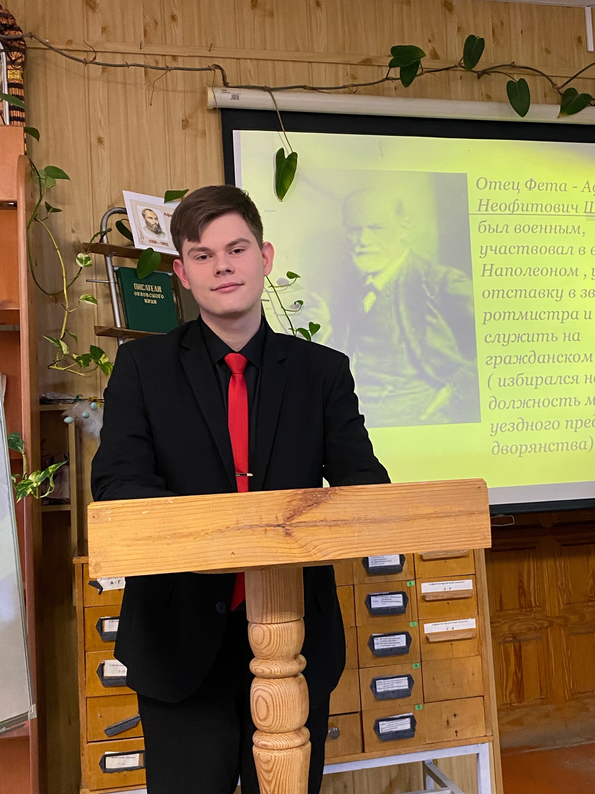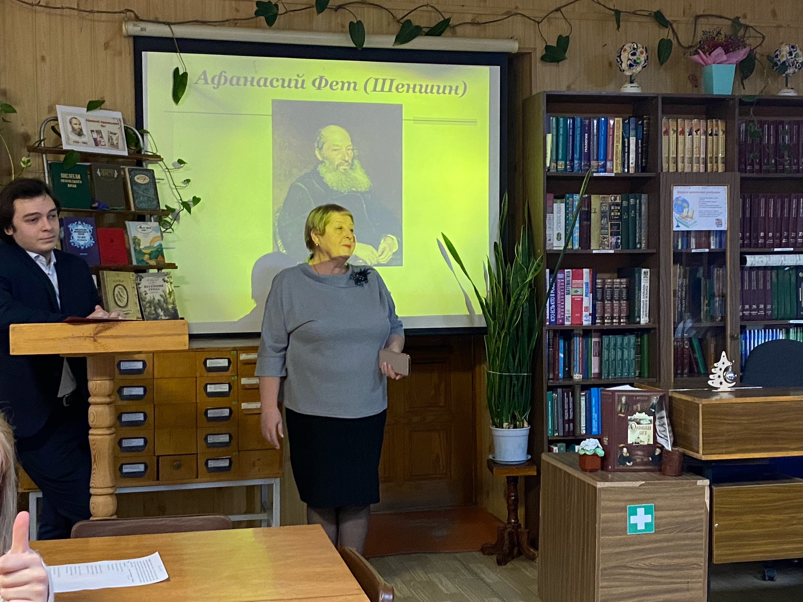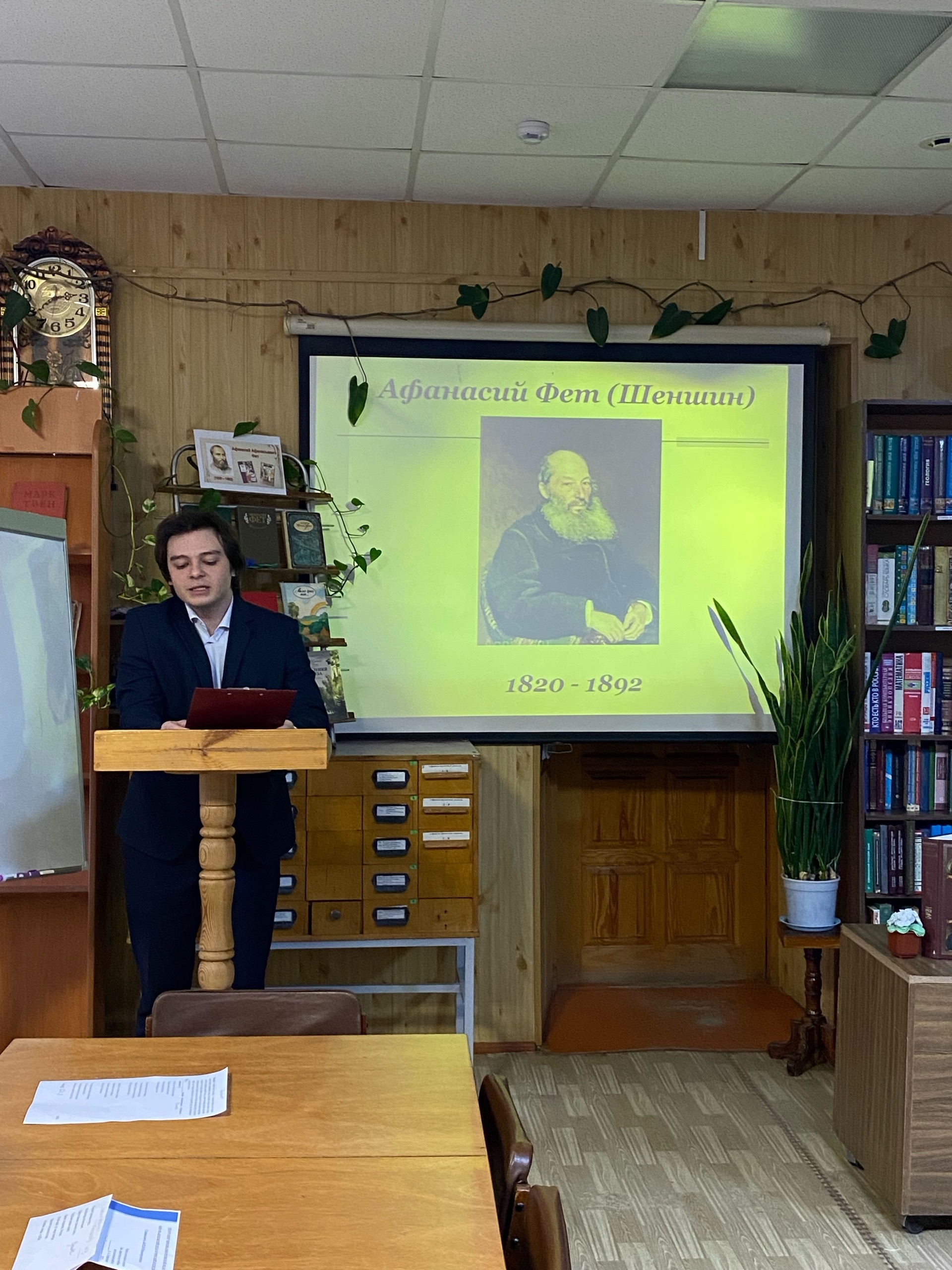 Литературная гостиная «Я верую, надеюсь и люблю», посвященная лирическому поэту, уроженцу Мценского уезда Афанасию Афанасьевичу Фету, прошла 5 декабря в стенах читального зала Болховского педагогического колледжа. Участниками мероприятия стали обучающиеся 3 курса специальности 40.02.01 Право и организация социального обеспечения. Студенты познакомились с биографией автора, а также прочитали наиболее известные и любимые стихотворения поэта. А. А. Фет — человек, несомненно, благородный, добрый, любящий, с тонко чувствующей душой, лирик. Нельзя не согласиться с Н. А. Некрасовым, который писал: «Смело можно сказать, что человек, понимающий поэзию и охотно открывающий душу свою её ощущениям, ни в одном русском авторе, после Пушкина, не почерпнет столько поэтического наслаждения, сколько доставит ему господин Фет».