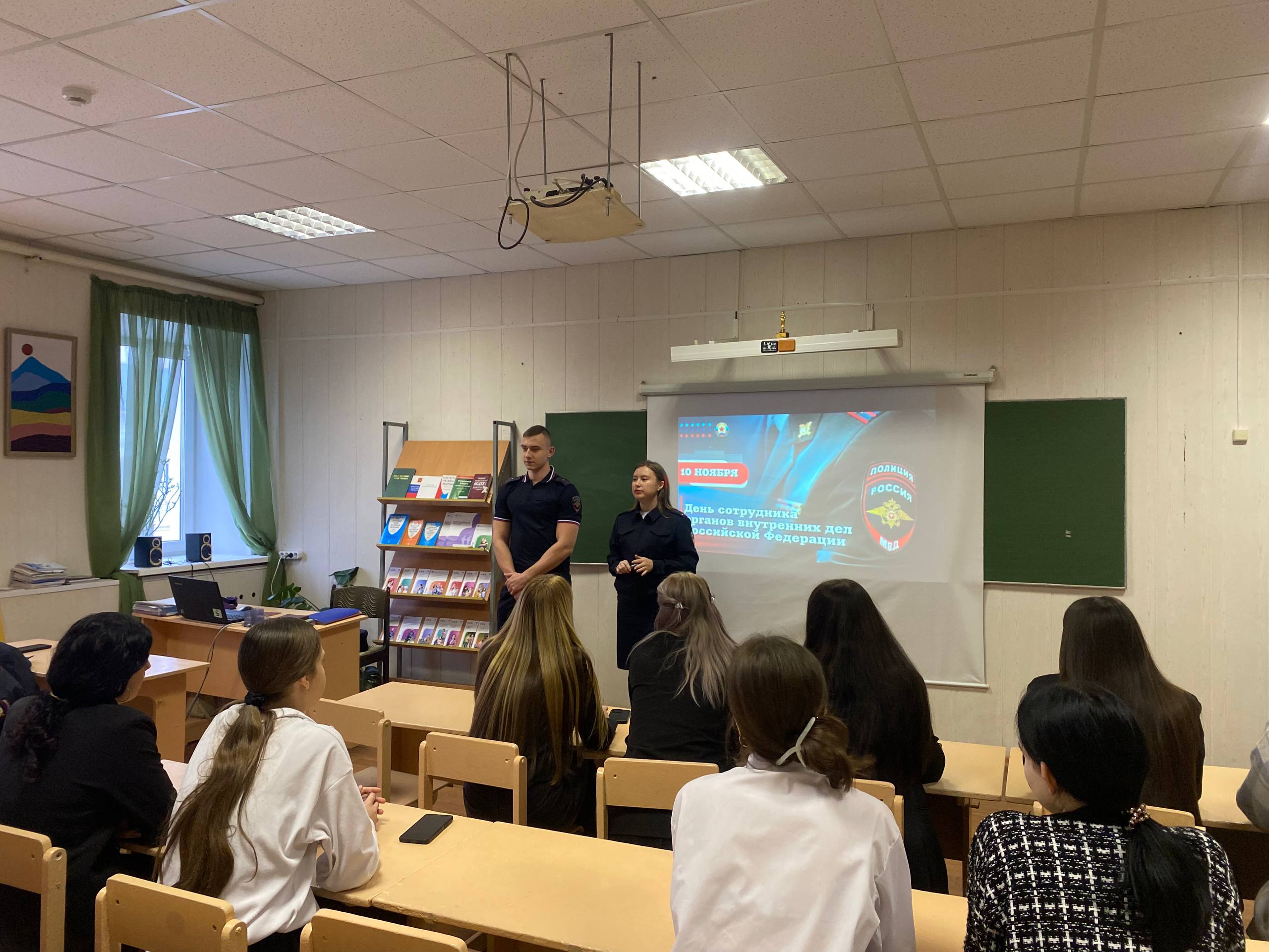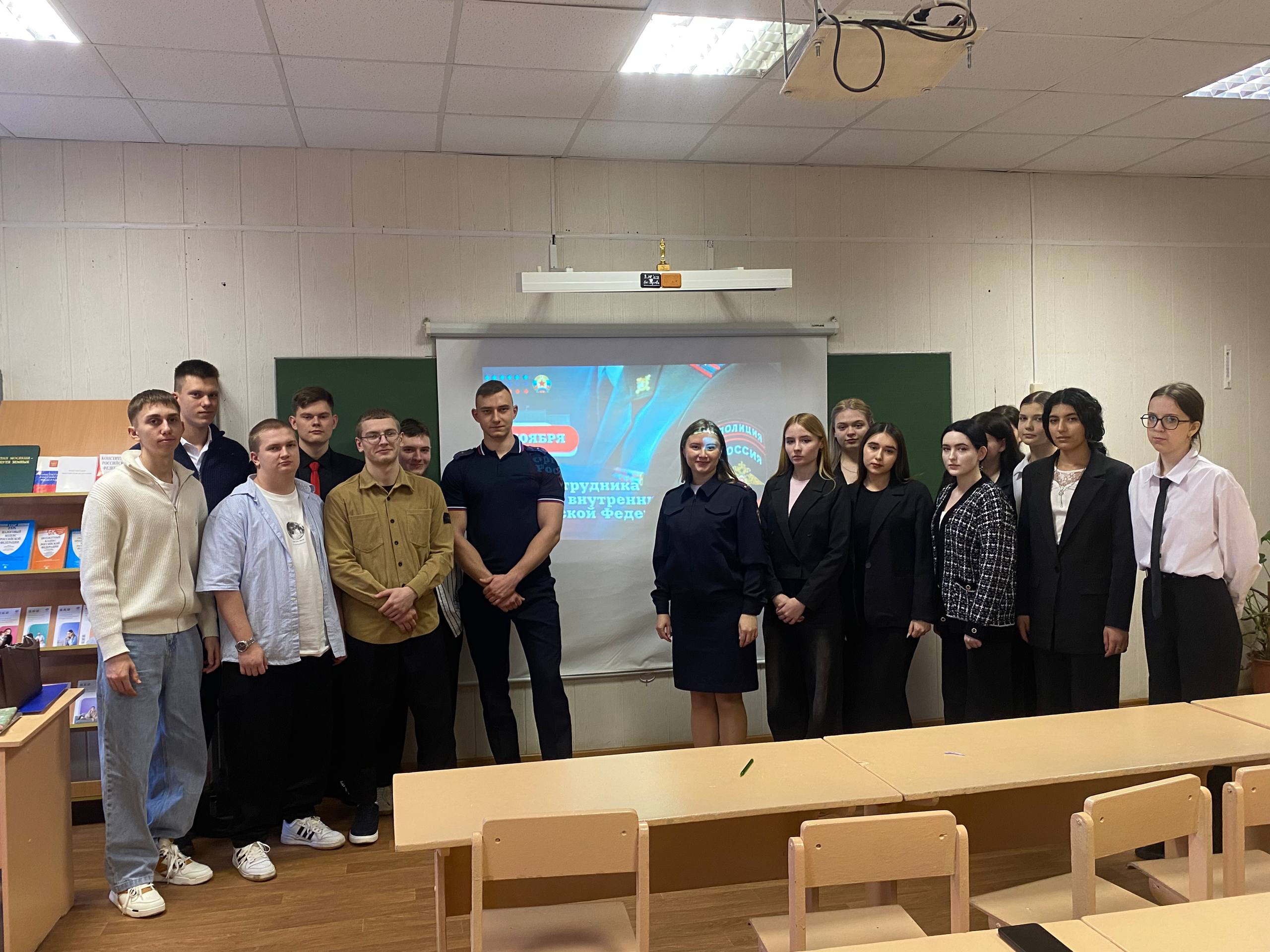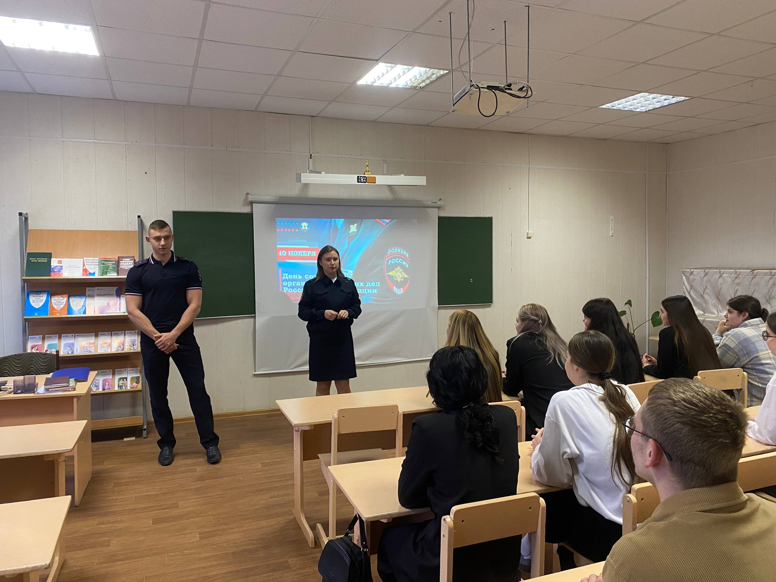 Ежегодно 10 ноября в России отмечают профессиональный праздник представители одной из самых сложных и опасных профессий - сотрудники органов внутренних дел РФ. В день профессионального праздника в стенах Болховского педагогического колледжа состоялась встреча с инспектором ПДН Болховского ОВД лейтенантом полиции Петуховой Ю.А. и стажером по должности участкового уполномоченного полиции, курсантом 5 курса Белгородского юридического института Нечушкиным В.Е. Обучающиеся 3 курса специальности 40.02.01 Право и организация социального обеспечения познакомились со спецификой работы в ОВД, задали интересующие вопросы. В память о сотрудниках органов внутренних дел, погибших при выполнении служебного долга прозвучала минута молчания. Обучающиеся вспомнили и почтили людей, которые ценой своей жизни спасли от опасности, тех, кто с оружием в руках защищал интересы нашего государства. Их подвиг служит примером беспредельной отваги мужества и героизма.