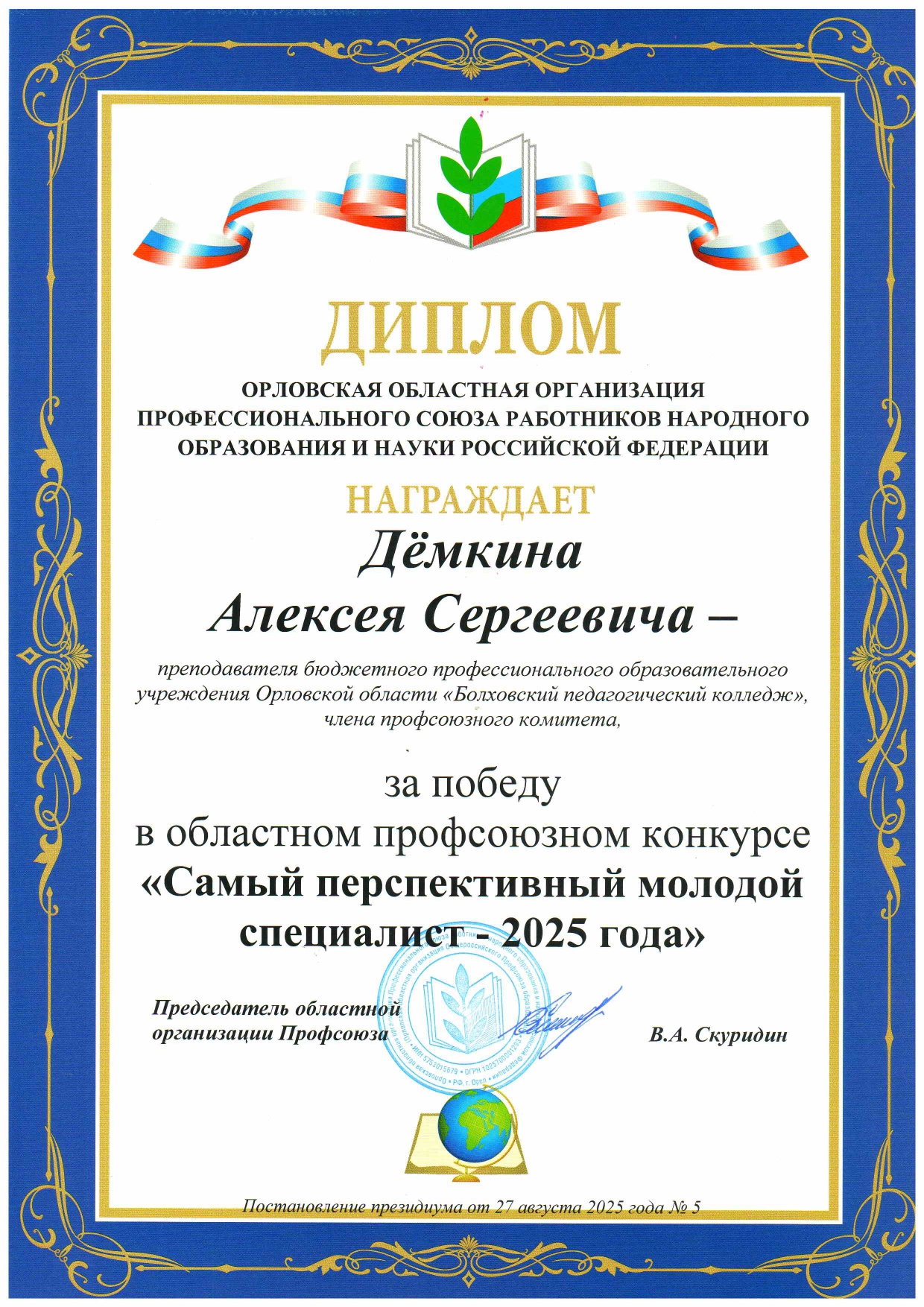 По итогам проведения конкурса, на основании итоговой оценки экспертной комиссии Дёмкин Алексей Сергеевич награжден дипломом за победу в областном профсоюзном конкурсе « Самый перспективный молодой специалист -2025 года»!