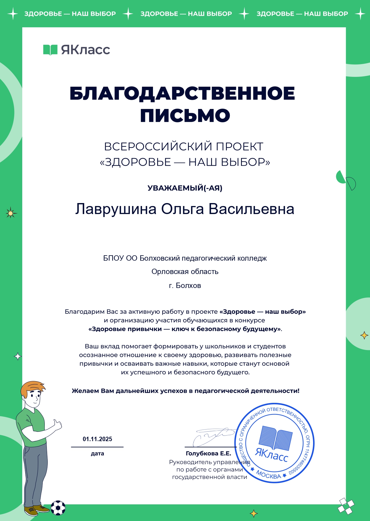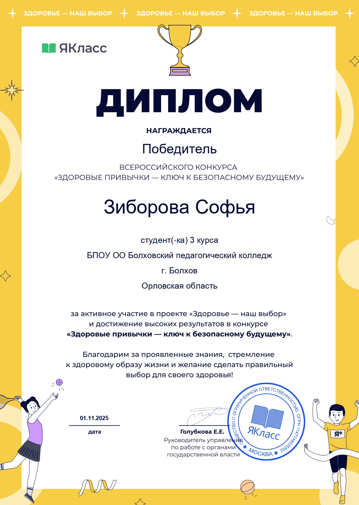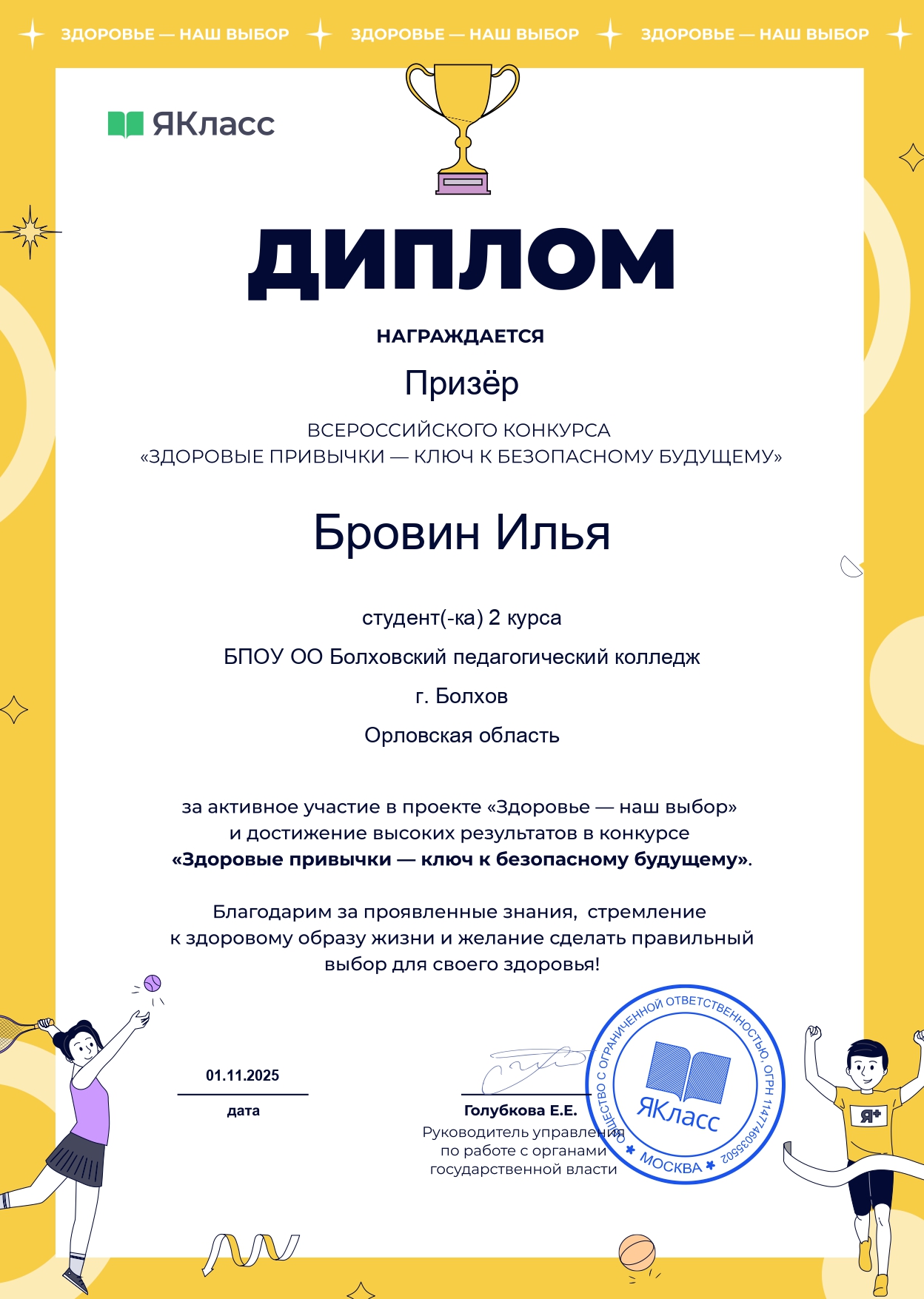 Всероссийская неделя здорового образа жизни «Здоровье — наш выбор» успешно проходит на платформе «ЯКласс» с 1 октября 2025 года. В рамках Всероссийской недели здоровья организован конкурс «Здоровые привычки — ключ к безопасному будущему», который позволяет обучающимся проверить свои знания на практике. Обучающиеся 2 – 3 курсов специальности 49.02.01 Физическая культура совместно с преподавателем Лаврушиной О. В. приняли активное участие в конкурсе, пополнив свои рабочие портфолио доступным теоретическим материалом, практическими упражнениями и тестами для самопроверки.