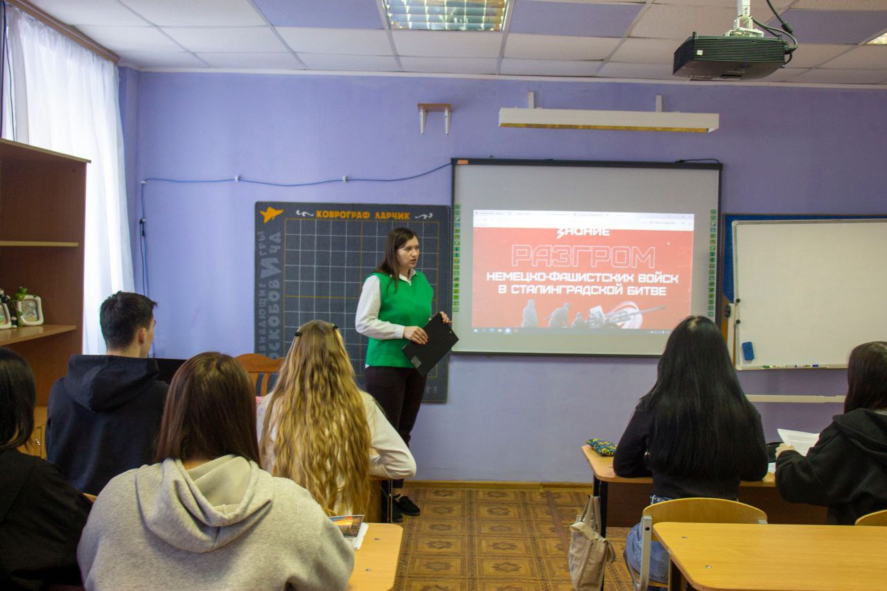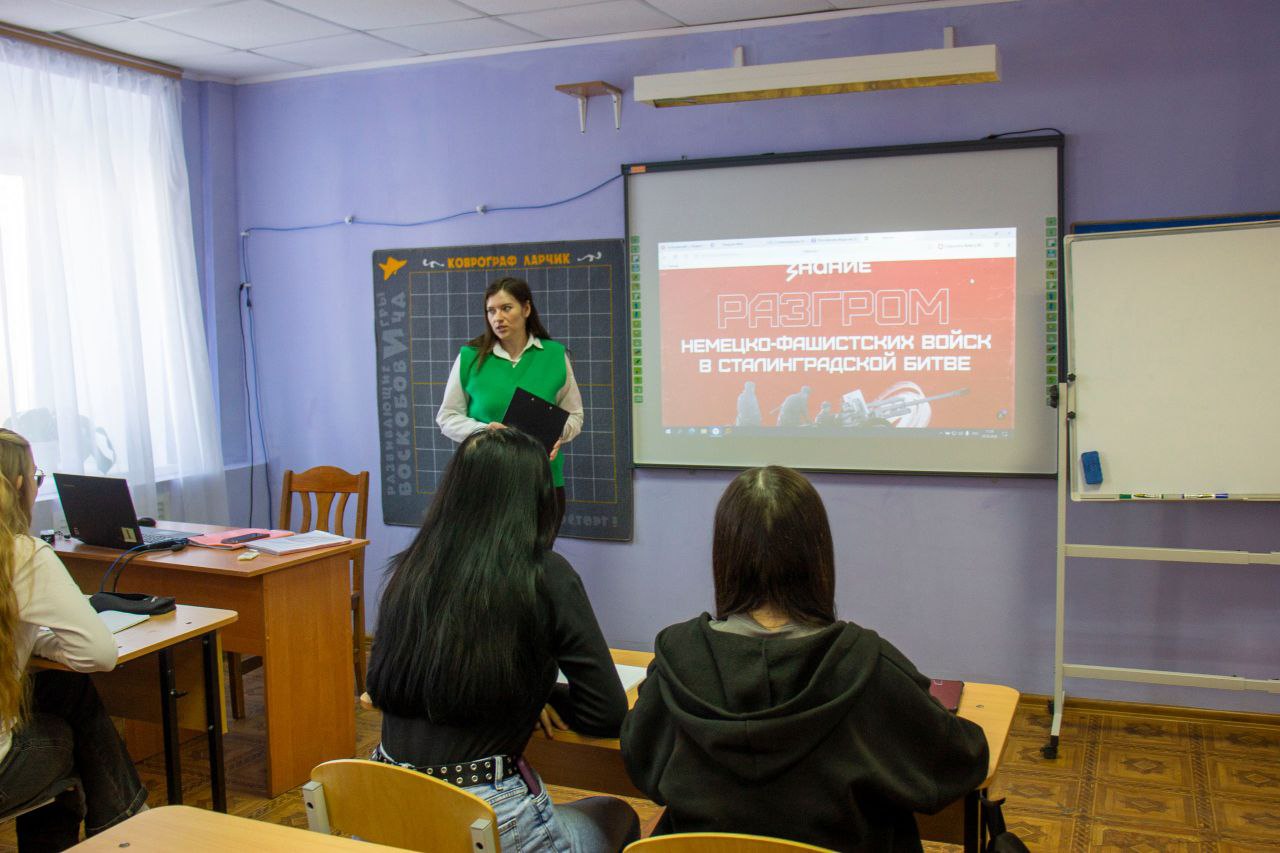 Сталинградская битва – одна из Величайших битв мировой истории. Сталинградское сражение стало одним из самых долгих и кровопролитных в истории Второй мировой войны, а сам город стал символом массового героизма, мужества, стойкости и самопожертвования. Советник директора по воспитанию и взаимодействию с детскими общественными объединениями Можайская А. В. в скорбную дату провела для обучающихся 1 курса специальности 44.02.02 Преподавание в начальных классах урок-память «Город русской славы», посвященный Дню разгрома советскими войсками немецко-фашистских войск в Сталинградской битве. На протяжении мероприятия подчеркивалась важность сохранения исторической памяти и уважения подвигов предков. Подобные уроки, несомненно, помогают молодому поколению осознать ценность мира и стабильности, достигнутых благодаря усилиям наших дедов и прадедов, а также способствуют формированию нравственных качеств, развитию гражданской ответственности.