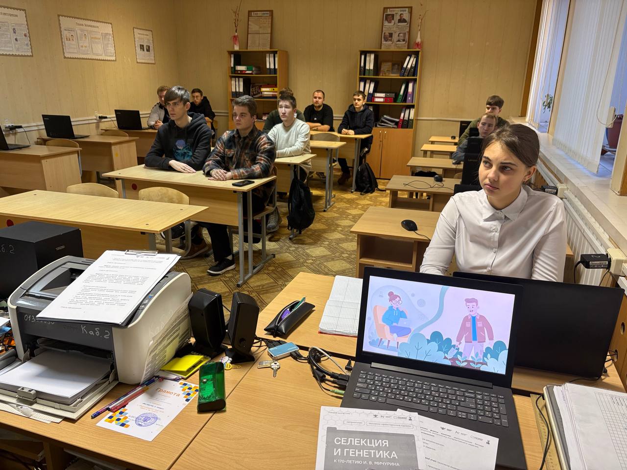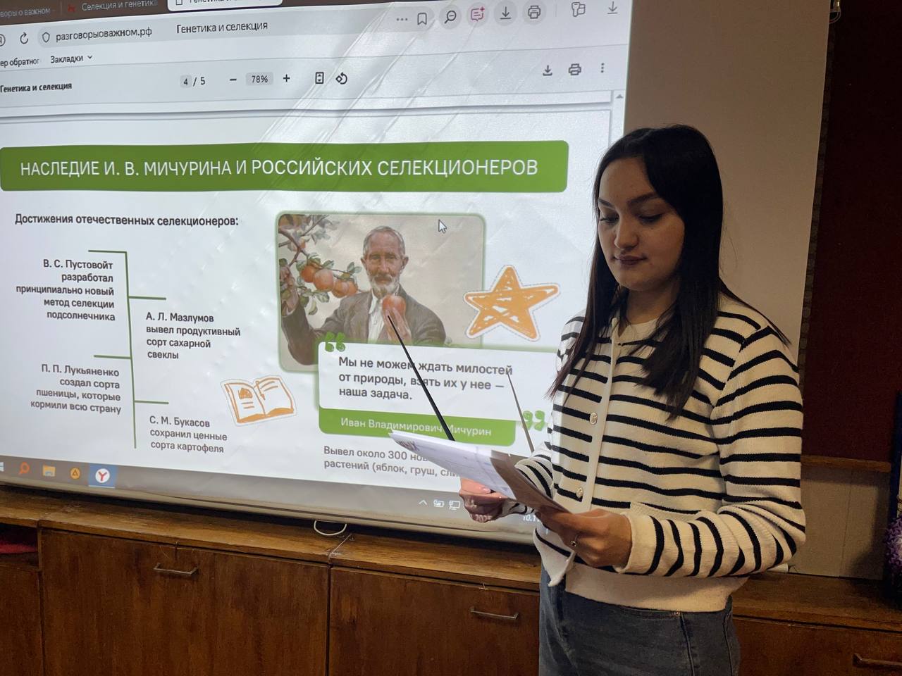 С целью формирования у обучающихся представлений о роли и значении селекции и генетики в развитии общества, о перспективности данного направления в качестве будущей профессии, знакомства обучающихся с деятельностью И. В. Мичурина, его вкладом в отечественную и мировую науку и практику, актуализации представлений об ответственном и бережном природопользовании, 10 ноября обучающиеся колледжа приняли участие во внеурочном занятие «Разговоры о важном». Генетика, селекция, генная инженерия сегодня стремительно развиваются. Фундаментальные знания, которые подарили нам известные ученые прошлого столетия, в сочетании с инновациями, которые открыли миру возможность изучать ДНК, открывают перед человечеством огромные возможности — от выведения новых сортов пшеницы до полной победы над неизлечимыми заболеваниями. Сегодня российские селекционеры добиваются значительных результатов. Внешние ограничения не стали преградой на пути развития агропромышленного комплекса, создали условия для активного импортозамещения и новых научных открытий.